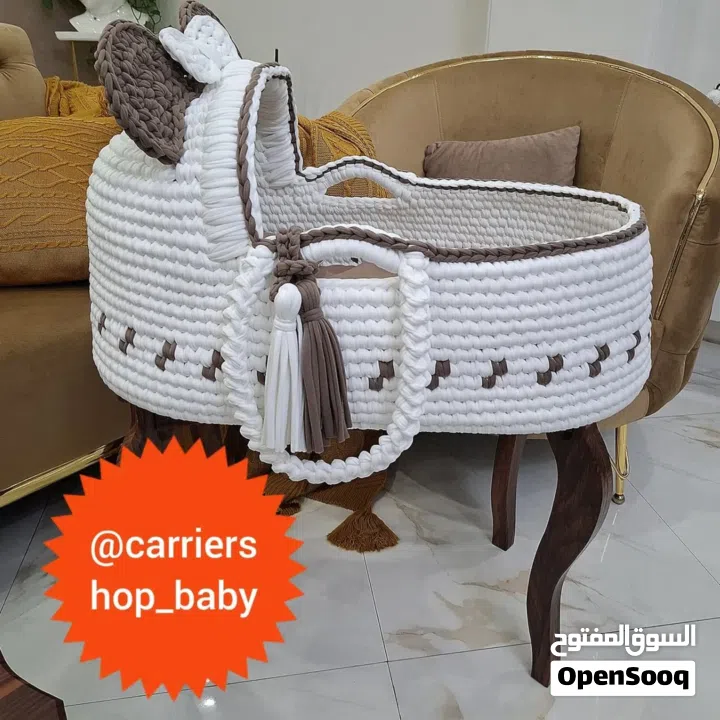 حامل و سلة حمل الأطفال (سلة تريكو للأطفال). مصنوعة بالكروشيه بخيوط تريكو عالية الجودة من إيران، وتم نسجها بطبقتين لتعزيز قوة الحامل. قاعدة الحامل مصنوعة من بلاكسي سميك بسمك 8 ملم وتتمتع بقوة عالية جدًا لتحمل وزن يصل إلى 20 كجم. هذا الحامل مناسب للرضع حتى سن سنة واحدة.